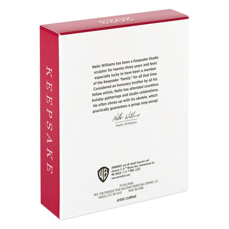 Relive the zany antics of the Animaniacs and celebrate the 30th anniversary of the wacky and witty characters with this Christmas tree ornament that features Yakko, Wakko and Dot. The energetic Warner brothers—and the Warner sister!—burst from their iconic shield icon in this colorful decoration that gives a fun nod to the clever cartoon’s opening scene.