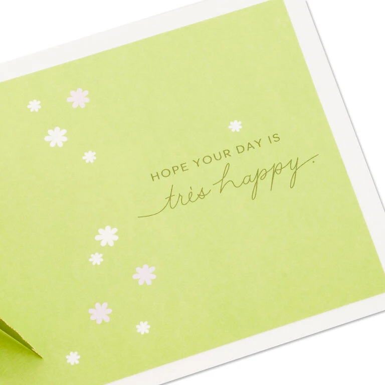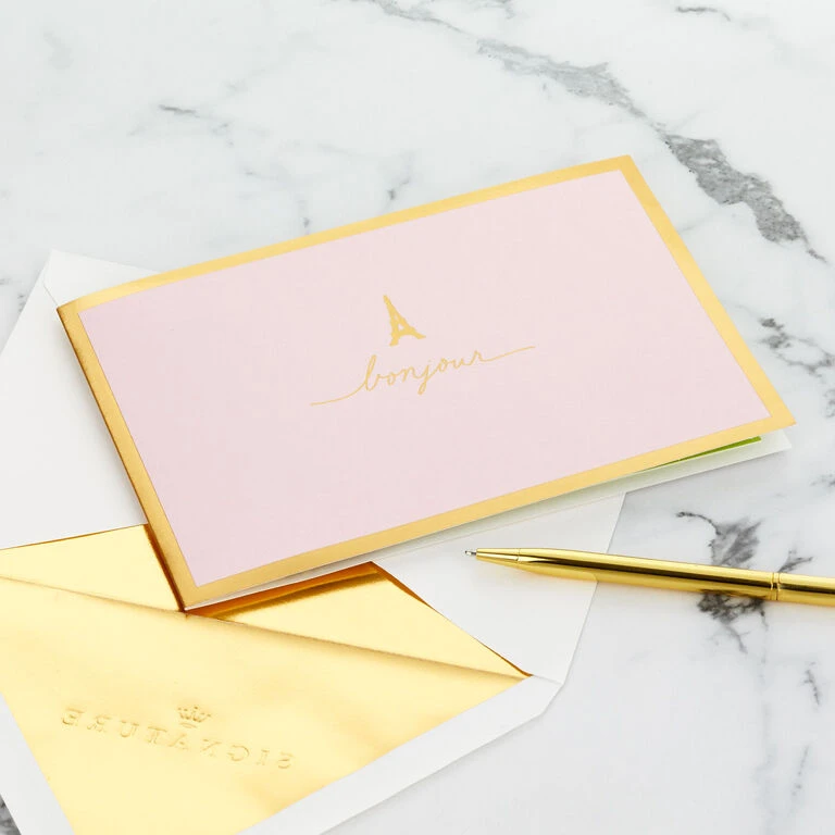 Pop-up hello greeting card features a pretty pink cover with metallic gold foil Eiffel Tower icon, border and a “bonjour” message on the front. Simply open the card to reveal the 3D pop-up surprise inside—no assembly required: an intricate, laser-cut Eiffel Tower and park scene accented with sparkly glitter pops out. Die-cut flowers, trees, balloons and a girl on a pink bicycle add fun touches to the inside of the card. This chic pop-up card with a bit of French flair is crafted from premium card stock and is a work of art sure to be displayed all year long, making it an unforgettable way to share a cheery hello or happy birthday wishes with Paris-loving friends or family members. When open, card lays flat for display; 3D pop-up inside measures approx. 5.5″ H.
