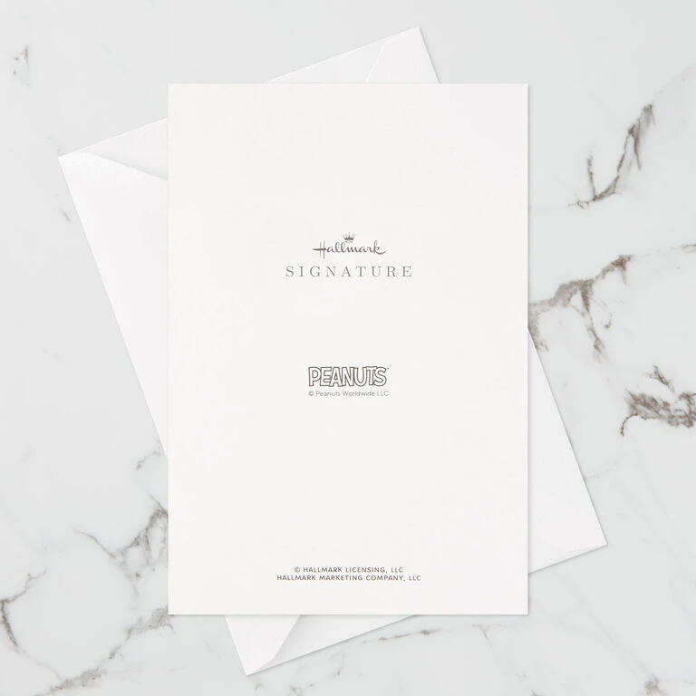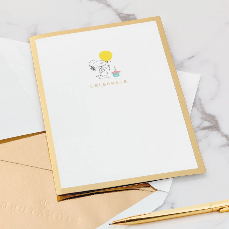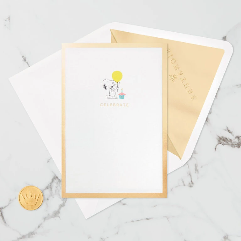Pop-up birthday greeting card features a smiling Snoopy with a cupcake and balloon paired with a “celebrate” message and border in gold foil. Simply open the card to reveal the 3D pop-up surprise inside—no assembly required: an intricate, laser-cut birthday party scene pops out featuring Snoopy atop his doghouse surrounded by Charlie Brown, Lucy, Linus, Sally, Woodstock and other members of the Peanuts Gang. Die-cut balloons, presents, pennant banner and confetti with foil accents add to the fun. This exquisite card crafted from premium card stock is a work of art sure to be displayed all year long, making it an unforgettable way to share happy birthday wishes with kids, friends, family members or any Peanuts fan. When open, this pop-up card lays flat for display; 3D pop-up inside measures approx. 3.25″ H.
