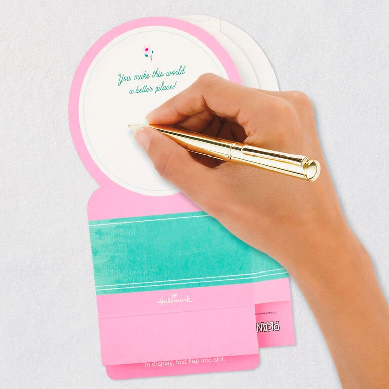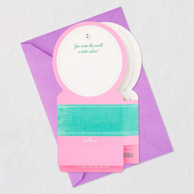 Pop-up Mother’s Day greeting card features a laser-cut, three-dimensional scene of Snoopy from Peanuts holding a bouquet of flowers for her in a 3D molded plastic snow globe-style design. Musical card plays a cheerful instrumental tune while confetti blows inside when button on front is pressed. Simply unfold the card (no assembly required) to create a fun surprise that can be displayed all year long. When open for display, 3D pop-up card measures approx. 7.13″ H.